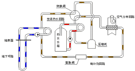 地源热泵供暖空调系统主要分3部分:室外地能换热系统、水源热泵机组和室内采暖空调末端系统。其中地源热泵机组主要有2种形式:水—水式或水—空气式。3个系统之间靠水或空气换热介质进行热量的传递,水源热泵与地能之间换热介质为水,与建筑物采暖空调末端换热,介质可以是水或空气。