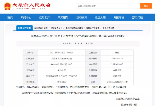 9月6日,太原市人民政府办公室发布《太原市空气质量巩固提升2021年行动计划的通知》(下称《通知》)。《通知》明确,太原市空气质量优良天数比例进一步提升,重污染天数较上年减少。空气质量中的二氧化硫、二氧化氮指标分别达到《环境空气质量标准》一级标准和二级标准。环境空气质量综合指数在全国168个重点城市中排名前移。二氧化硫、氮氧化物和挥发性有机物排放量较上年下降2%以上。完成国家、省下达太原市的大气约束性指标。